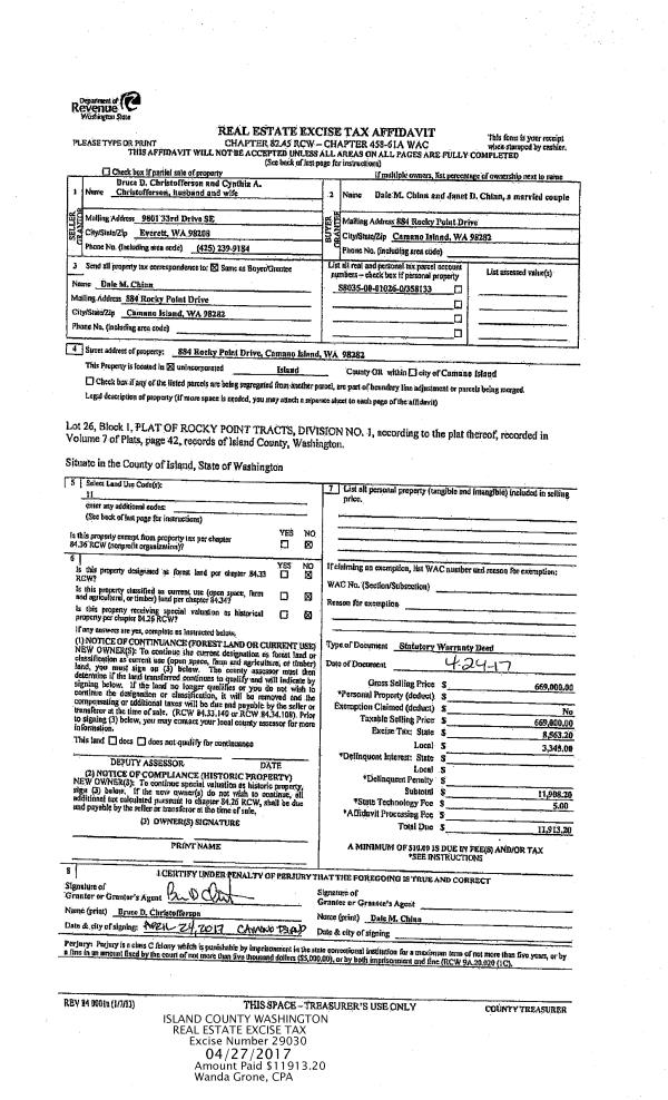 | Mailing Address: | CARLA DONNELSON 200 DRIFTWOOD SHORES RD CAMANO ISLAND, WA 98282 | % Ownership: | 100.0000000000% |