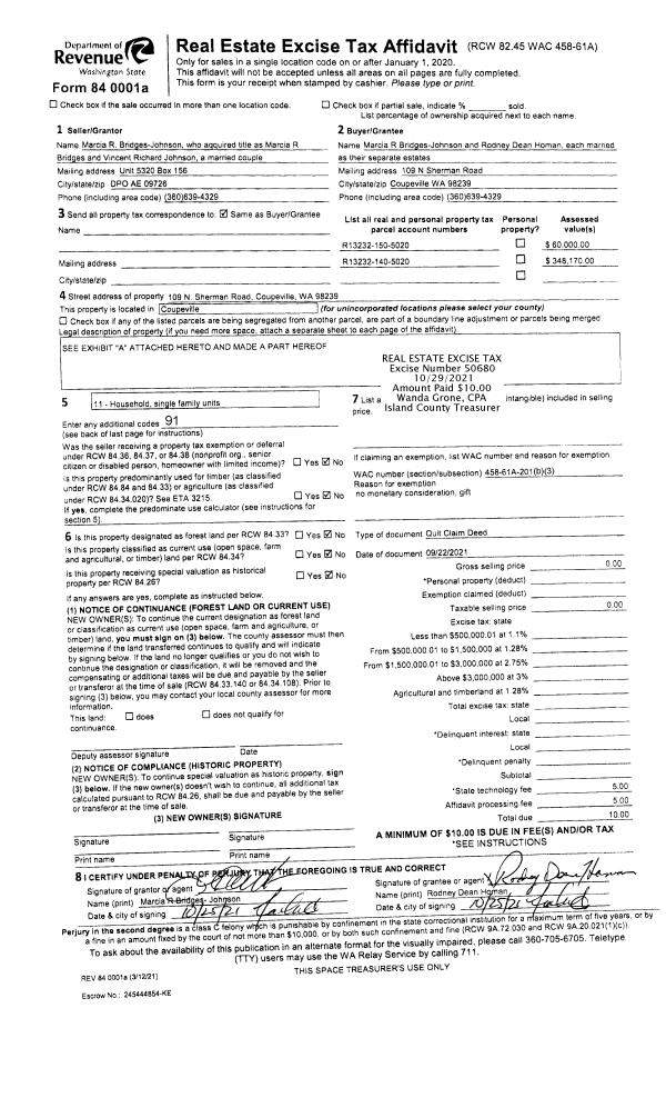 | Mailing Address: | 256 DRIFTWOOD SHORES CAMANO ISLAND, WA 98282 | % Ownership: | 100.0000000000% |