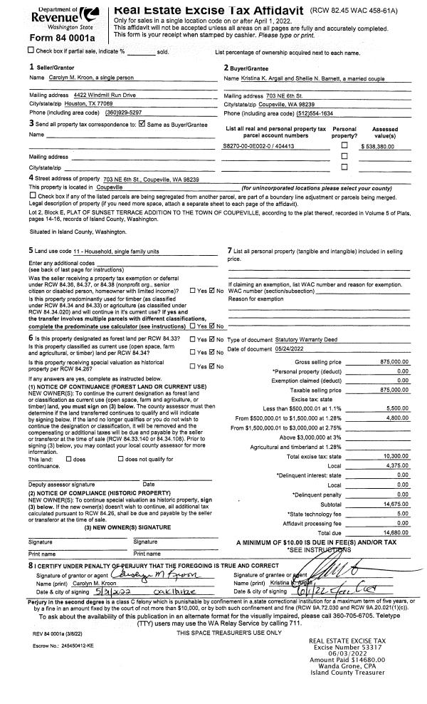 | Mailing Address: | LARAE B MARKS 609 N SUNRISE BLVD CAMANO ISLAND, WA 98282-8706 | % Ownership: | 100.0000000000% |