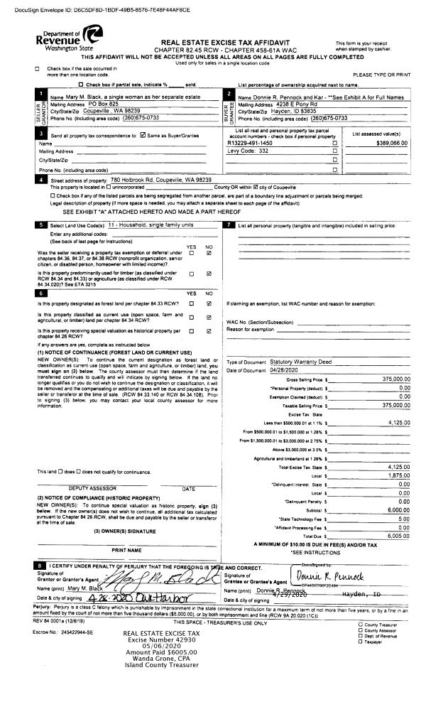 | Mailing Address: | THERESA KINGSTON 7085 HUMPHREY RD CLINTON, WA 98236 | % Ownership: | 100.0000000000% |