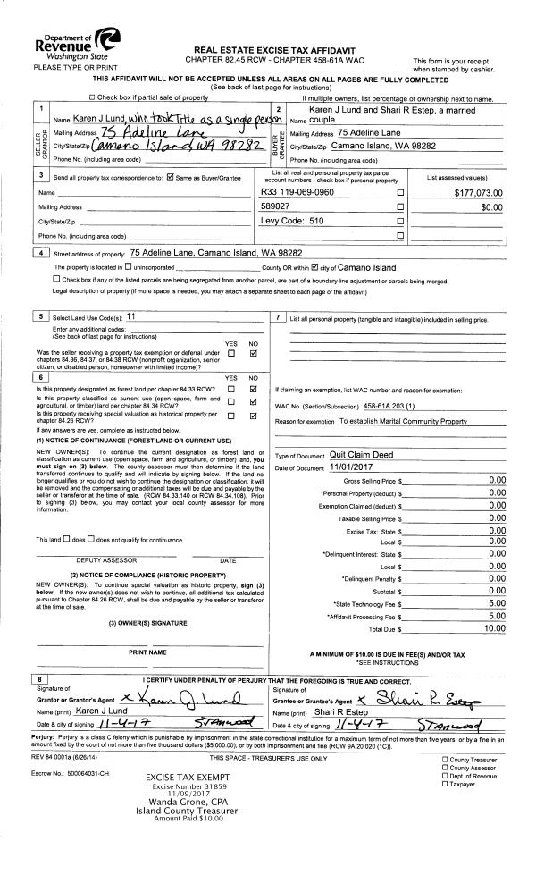 | Mailing Address: | WENDY L JOHNSON 1212 RICKOVER DR COUPEVILLE, WA 98239 | % Ownership: | 100.0000000000% |