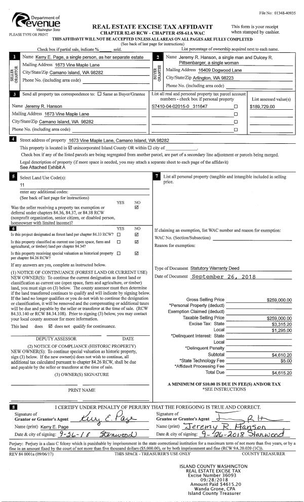 | Mailing Address: | SAMANTHA PETERSON 1206 DEWEY DR COUPEVILLE, WA 98239 | % Ownership: | 100.0000000000% |