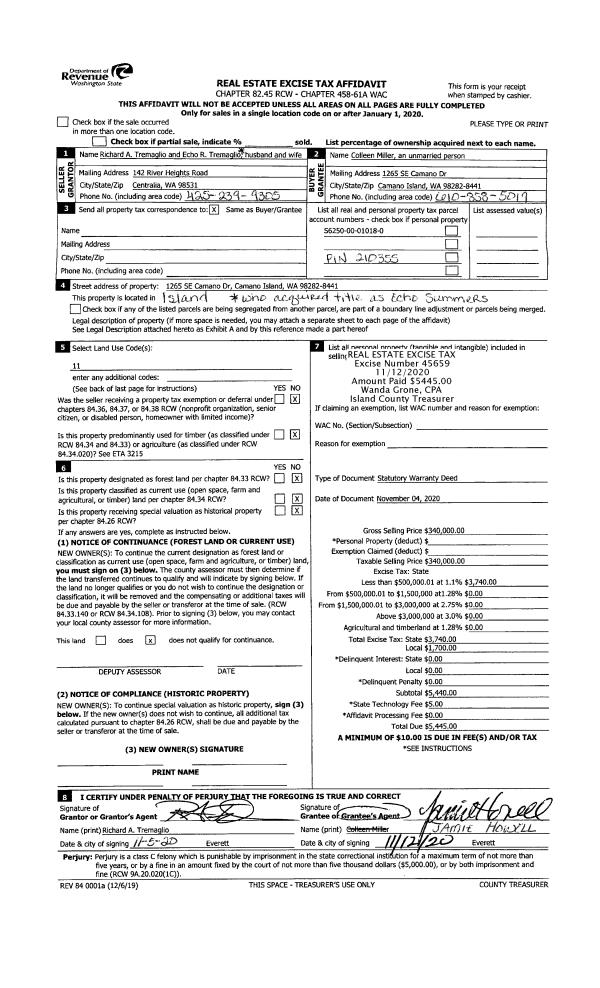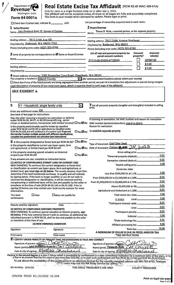 | Mailing Address: | 1240 DEWEY DR COUPEVILLE, WA 98239 | % Ownership: | 100.0000000000% |
