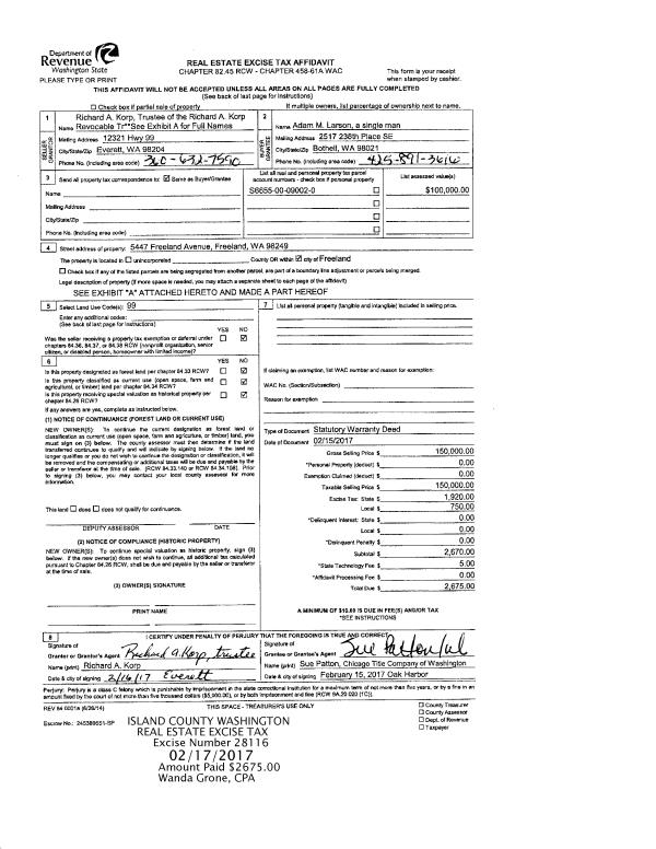 | Mailing Address: | 1226 MITSCHER DR COUPEVILLE, WA 98239 | % Ownership: | 100.0000000000% |