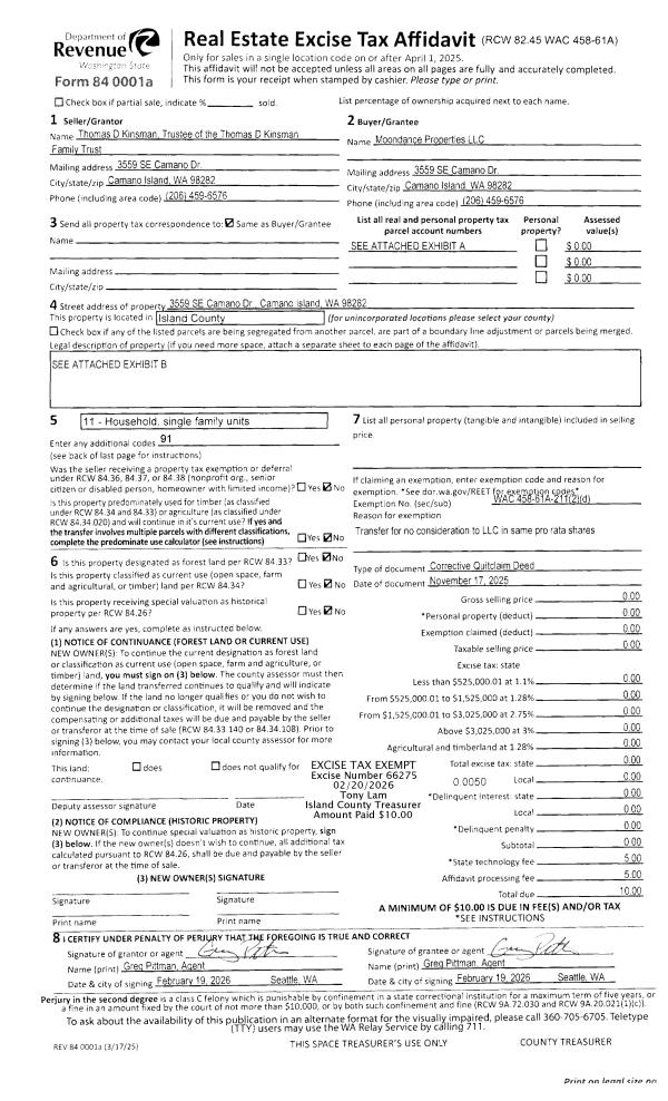 | Mailing Address: | TRACEY FLUM BARBARA DETERING DAVID KAUFF 1916 SHORE AVE FREELAND, WA 98249 | % Ownership: | 100.0000000000% |