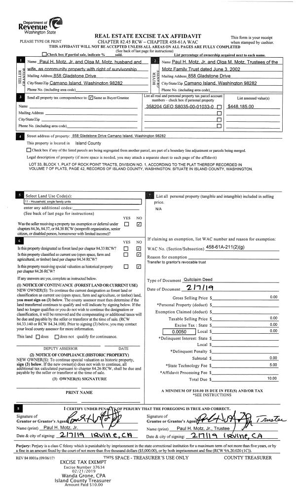 | Mailing Address: | 17036-ISLAND VIEW LN LA CONNER, WA 98257 | % Ownership: | 100.0000000000% |