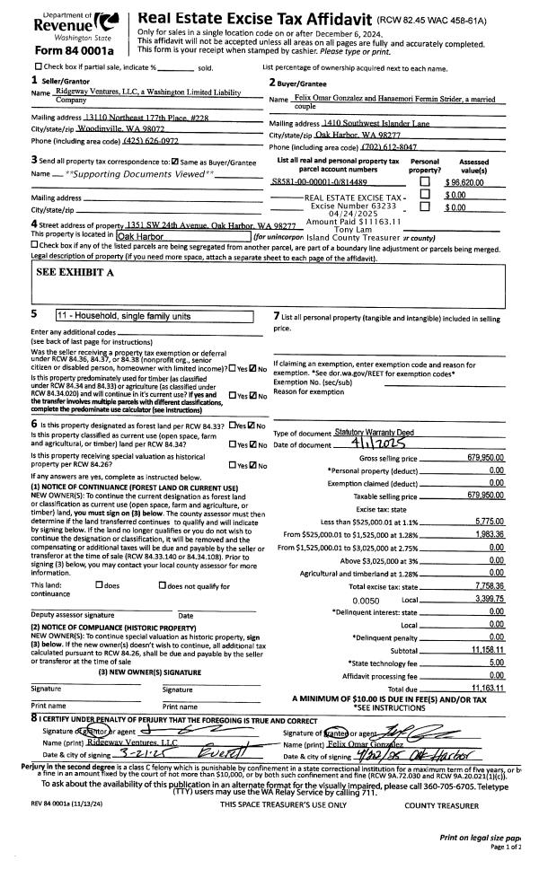 | 1 | 07/27/2010 | QCD | Quit Claim Deed | STATE OF WASHINGTON | | | | | 1970 | 4278587 |