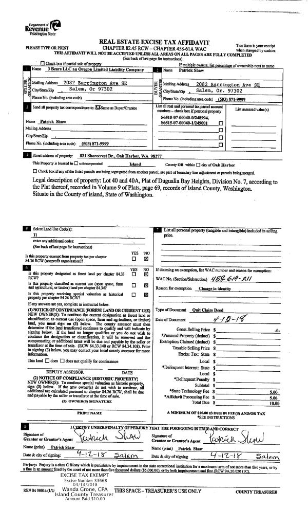 | Mailing Address: | SHANNON M DURHAM 640 SW FRANKLIN CT OAK HARBOR, WA 98277 | % Ownership: | 100.0000000000% |
