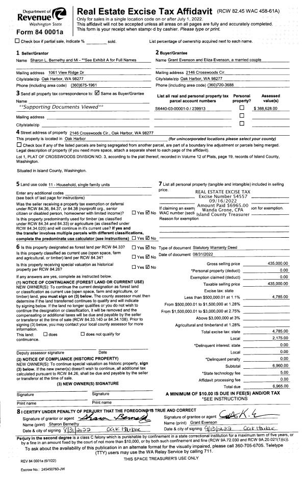 | Mailing Address: | 396 MACBRAE DR CAMANO ISLAND, WA 98282 | % Ownership: | 100.0000000000% |