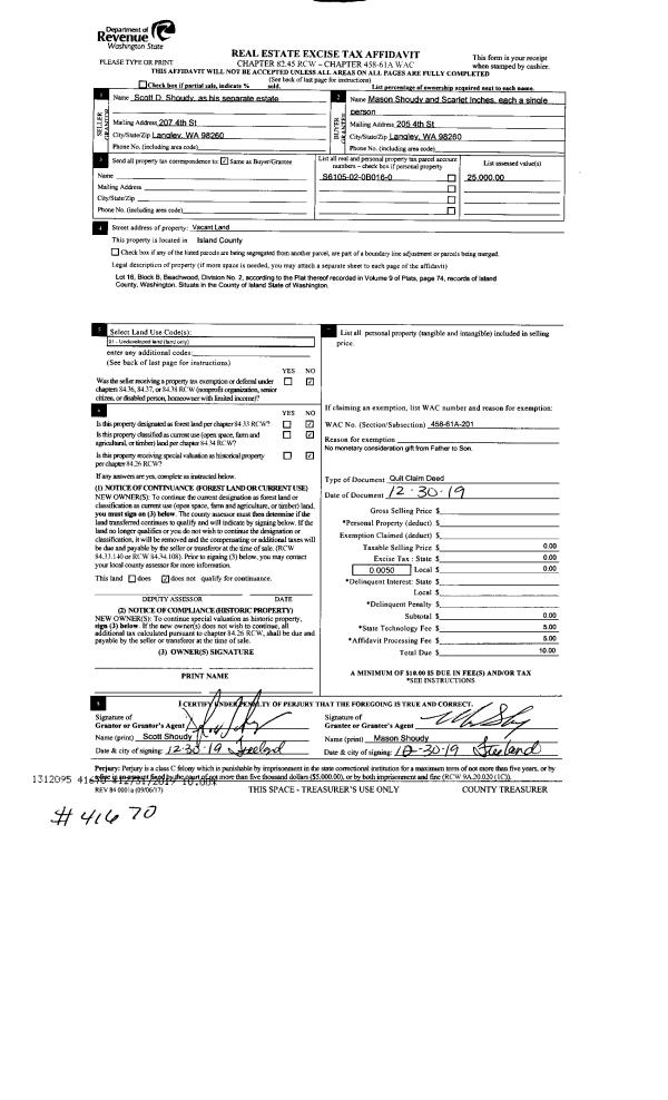 | Mailing Address: | INGRID H TALEY ANNE MELIZA RICK MELIZA 1066 S WEST CAMANO DR CAMANO ISLAND, WA 98282 | % Ownership: | 100.0000000000% |