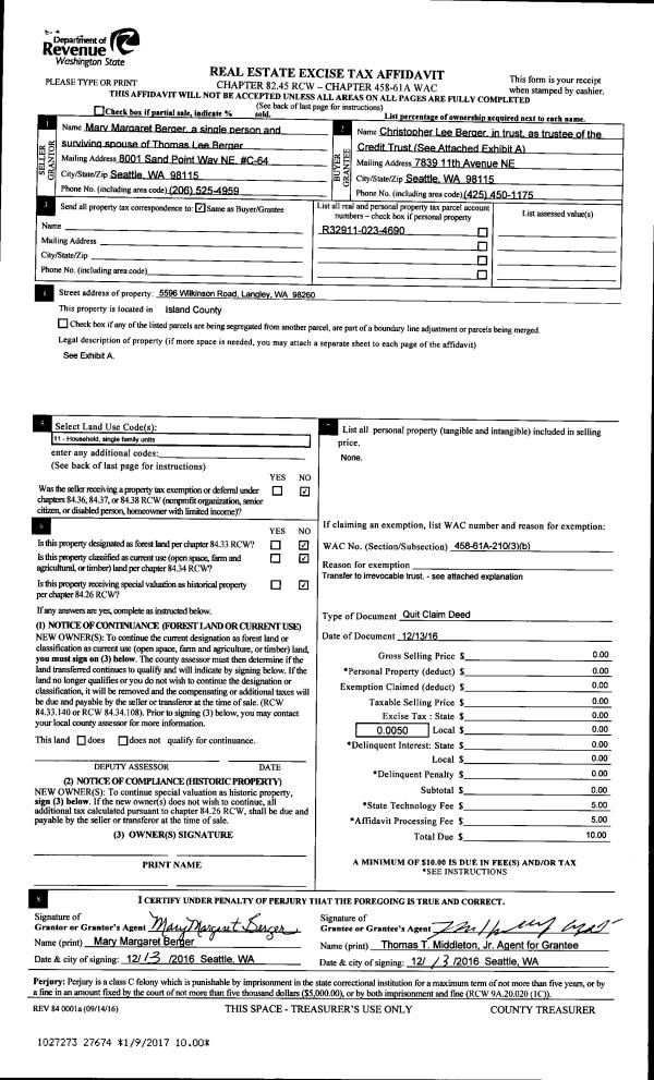 | Mailing Address: | TAMMY JASMER 1524 SE CAMANO DR CAMANO ISLAND, WA 98282 | % Ownership: | 100.0000000000% |