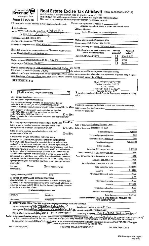 | Mailing Address: | MARTINA O'CONNELL 1372 RAINBOW LN CAMANO ISLAND, WA 98282 | % Ownership: | 100.0000000000% |