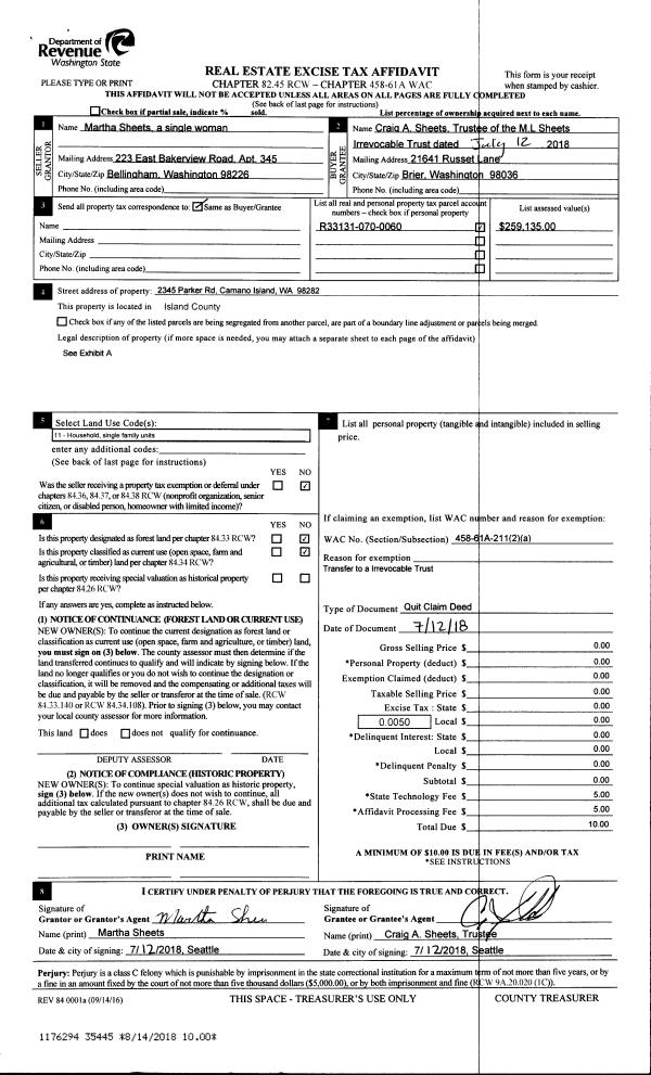 | Mailing Address: | 1326 BEACH DR CAMANO ISLAND, WA 98282 | % Ownership: | 100.0000000000% |