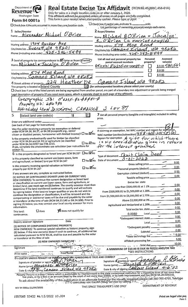 | Mailing Address: | 1948 CASCADE VIEW DR CAMANO ISLAND, WA 98282 | % Ownership: | 100.0000000000% |