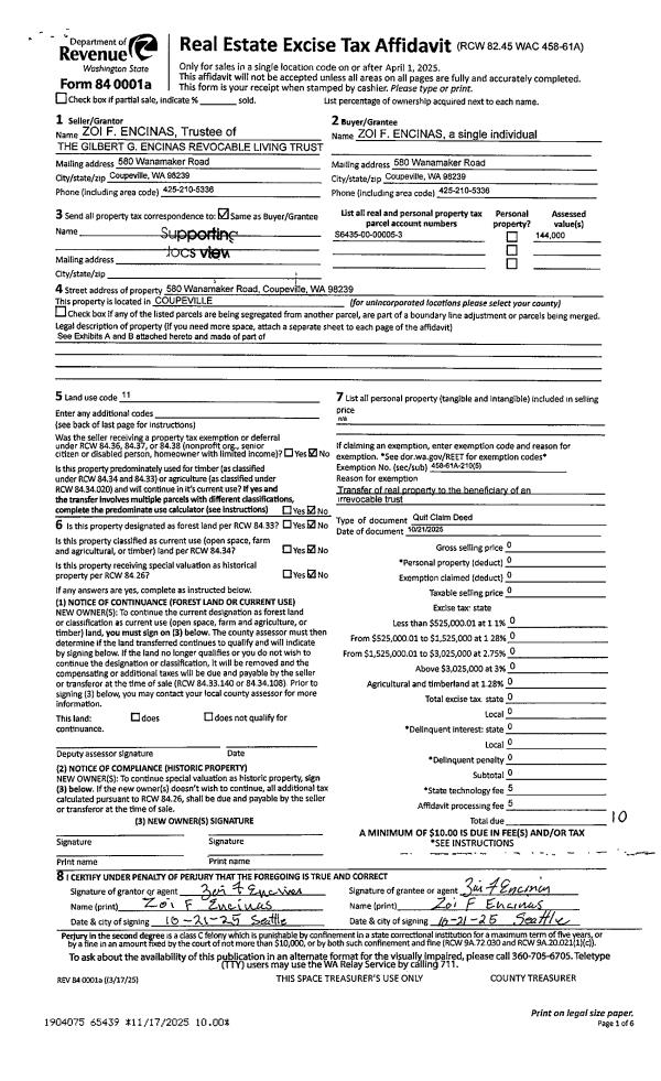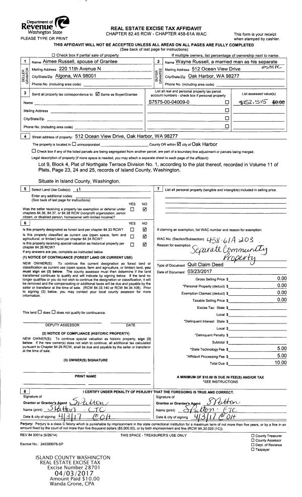 | Mailing Address: | TINA MICHELLE MORGAN 396 EVERGREEN PARK RD CAMANO ISLAND, WA 98282 | % Ownership: | 100.0000000000% |