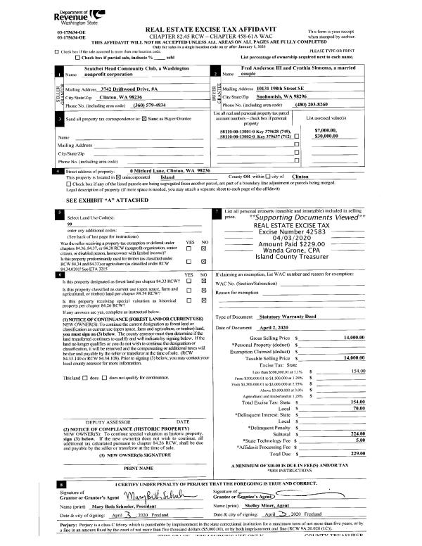 | 1 | 08/20/2019 | EZ | Easement | HANNEMAN, STEPHEN M | PUGET SOUND ENERGY | | | $2,375.00 | 41282 | 4476625 |
