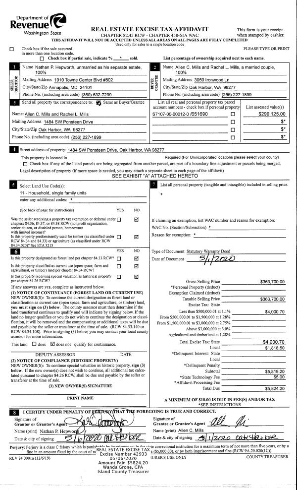 | 1 | 08/20/2019 | EZ | Easement | O'NEILL, PATRICE J | PUGET SOUND ENERGY | | | $5,660.00 | 40958 | 4474781 |