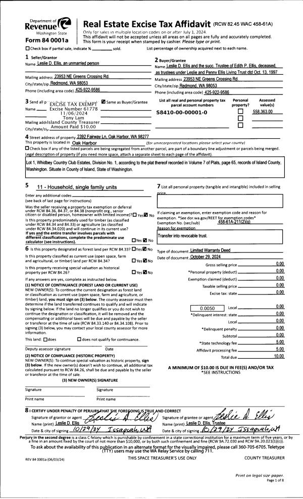 | Mailing Address: | ELIZA EVENSON 2146 CROSSWODS CIRCLE OAK HARBOR, WA 98277 | % Ownership: | 100.0000000000% |