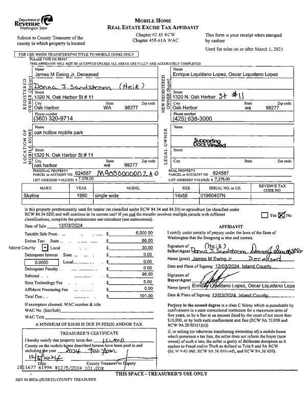 | Mailing Address: | 2125 COLONIAL WAY OAK HARBOR, WA 98277 | % Ownership: | 100.0000000000% |