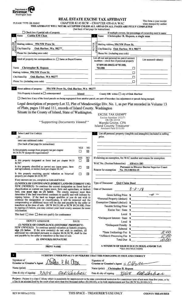 | Mailing Address: | 965 HILLSIDE DR CAMANO ISLAND, WA 98282 | % Ownership: | 100.0000000000% |