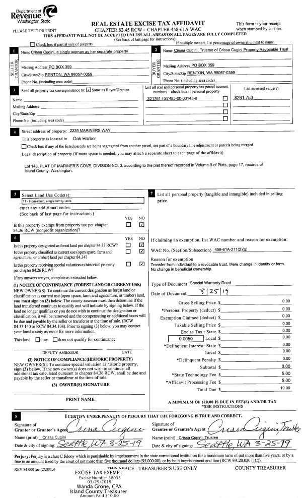 | Mailing Address: | 658 LEHMAN DR CAMANO ISLAND, WA 98282 | % Ownership: | 100.0000000000% |
