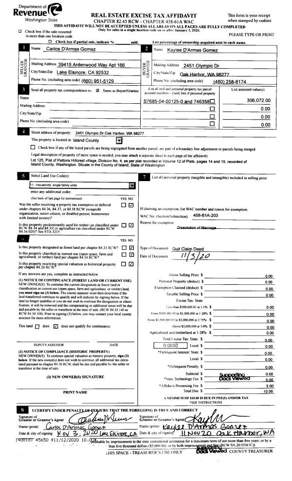 | Mailing Address: | 633 NW CATHLAMET DR OAK HARBOR, WA 98277 | % Ownership: | 100.0000000000% |