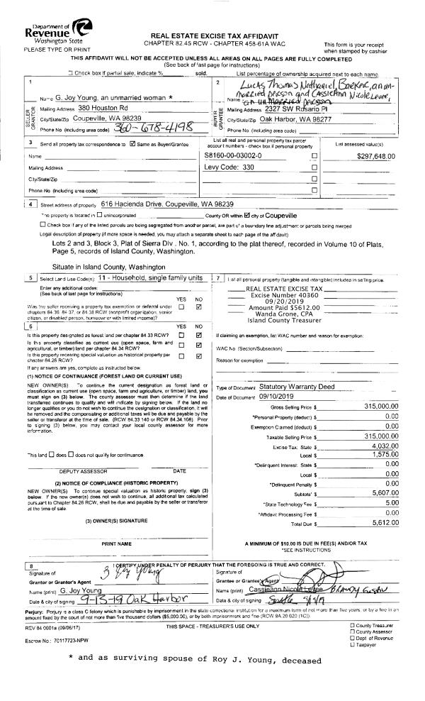 | 4 | 02/01/1992 | WD | Warranty Deed | CARSCADDEN, HUGH | TISHER, RALPH/PATRICIA & | | | $12,500.00 | 20850 | 92004325 |