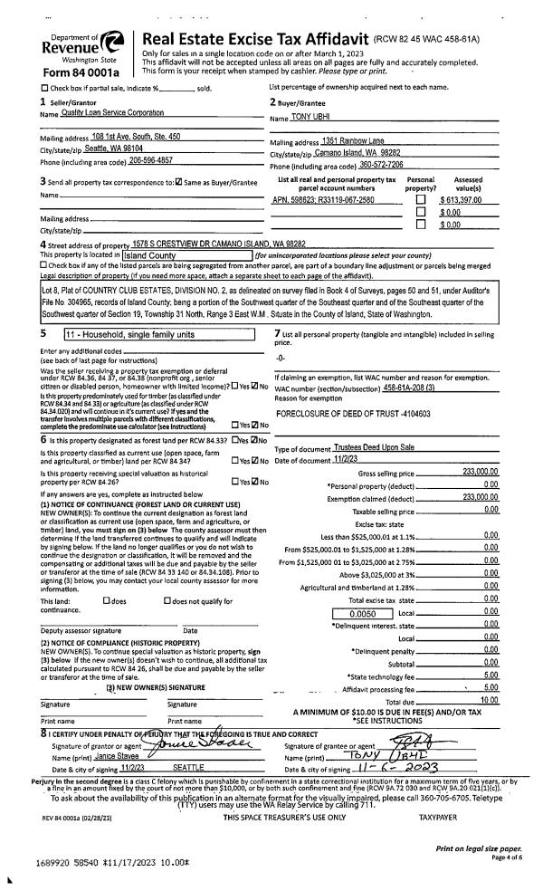 | Mailing Address: | VINCENT J QUIDACHAY 5010 BAKERVIEW RD OAK HARBOR, WA 98277 | % Ownership: | 100.0000000000% |