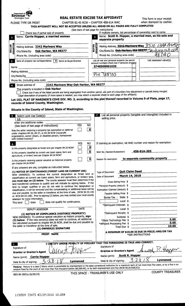 | Mailing Address: | 638 FORREST WAY CAMANO ISLAND, WA 98282 | % Ownership: | 100.0000000000% |