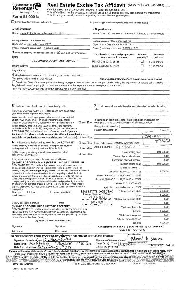 | 3 | 10/29/2018 | WD | Warranty Deed | MCPHERSON JTWROS, D J & J H | HISTORIC WHIDBEY | | | $265,000.00 | 36505 | 4454352 |