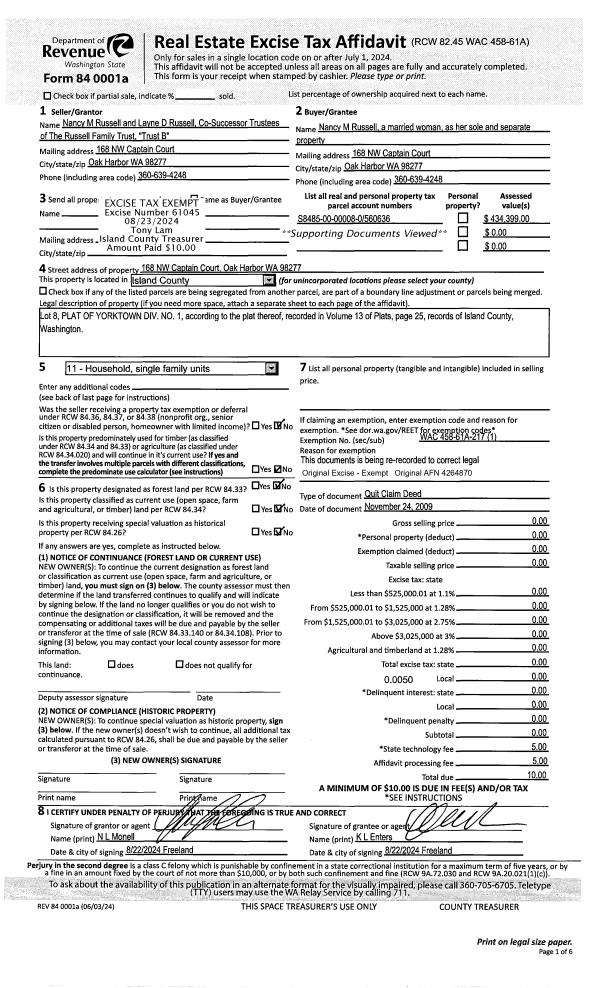 | Mailing Address: | HAROLD E HOBSON TRUSTEE 1238 SW LOPEZ DR OAK HARBOR, WA 98277-2278 | % Ownership: | 100.0000000000% |