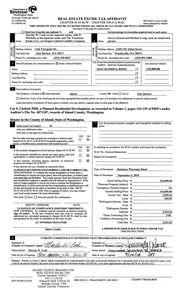 | Mailing Address: | PATRICIA MARSHALL 142 HARRINGTON RD COUPEVILLE, WA 98239-9557 | % Ownership: | 100.0000000000% |