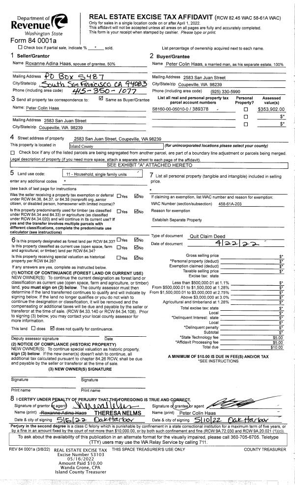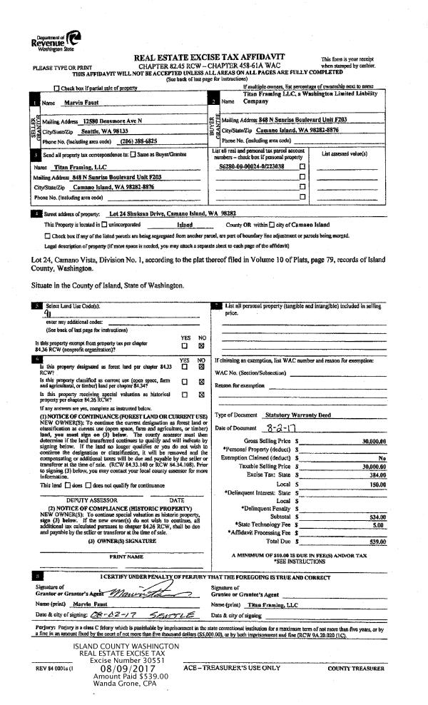| Mailing Address: | 1463 RIDGE DR CAMANO ISLAND, WA 98282 | % Ownership: | 100.0000000000% |