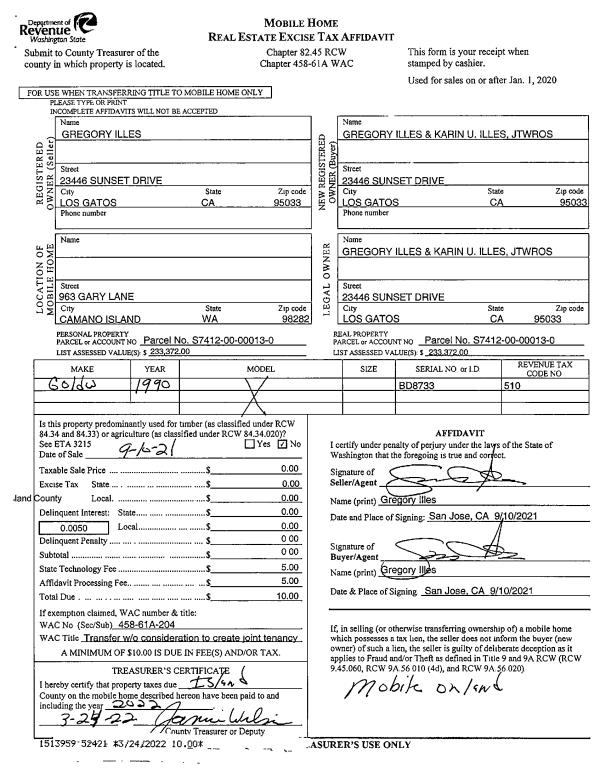 | Mailing Address: | 1599 SILVER FIR DR CAMANO ISLAND, WA 98282 | % Ownership: | 100.0000000000% |