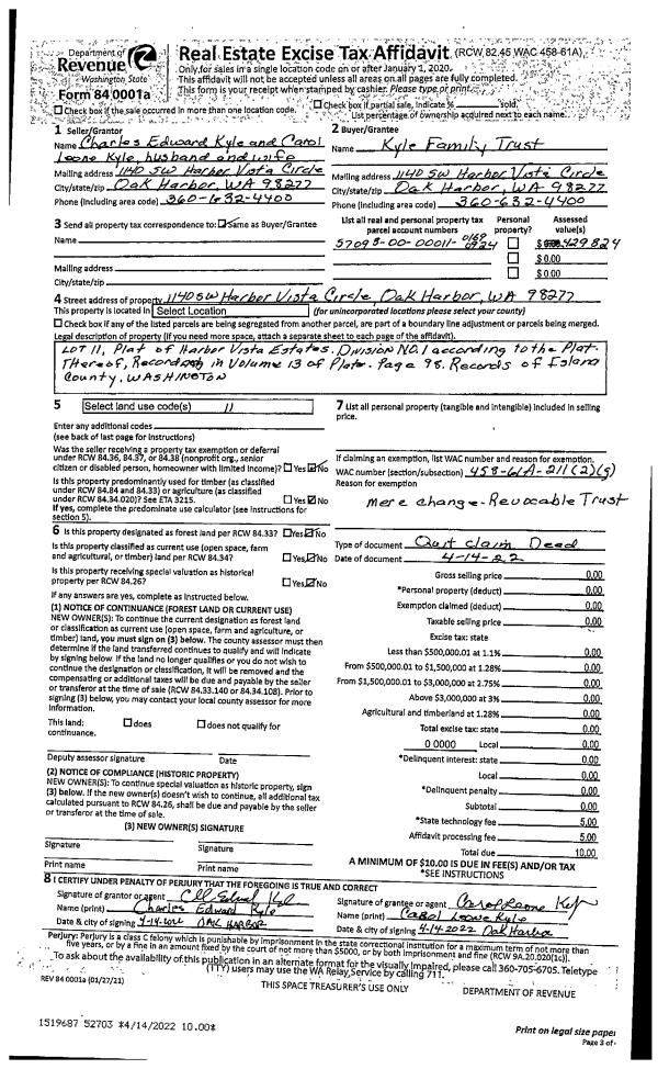 | Mailing Address: | 1633 HEMLOCK DR CAMANO ISLAND, WA 98282 | % Ownership: | 100.0000000000% |
