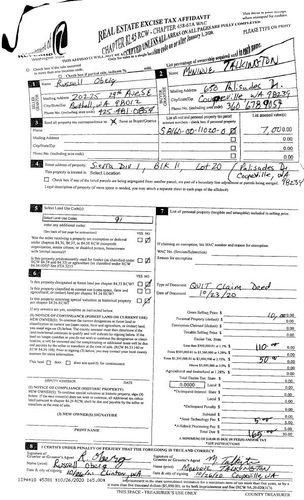 | Mailing Address: | PATRICIA KIERNAN 2216 MARINERS WAY OAK HARBOR, WA 98277 | % Ownership: | 100.0000000000% |