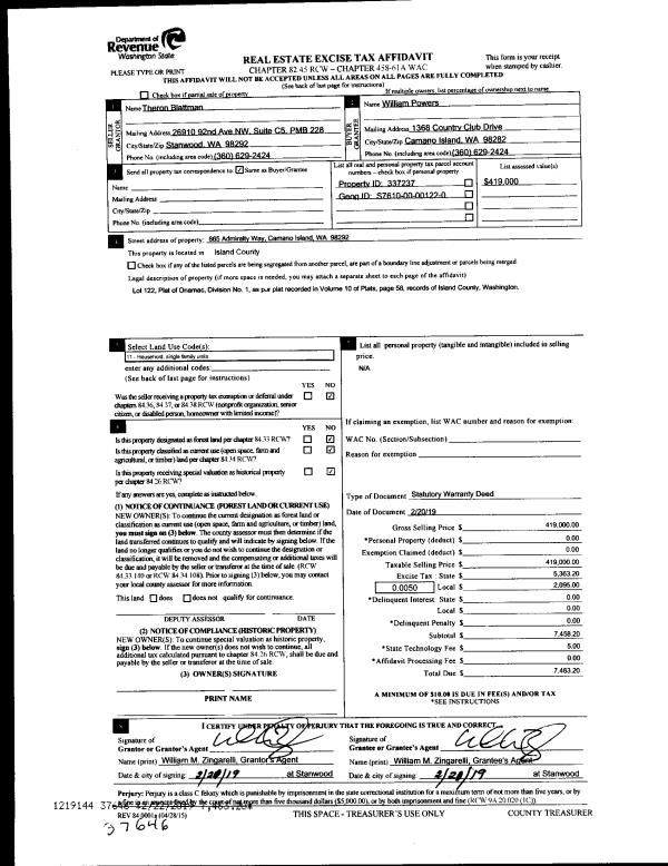 | Mailing Address: | 762 INDIAN BEACH RD CAMANO ISLAND, WA 98282 | % Ownership: | 100.0000000000% |
