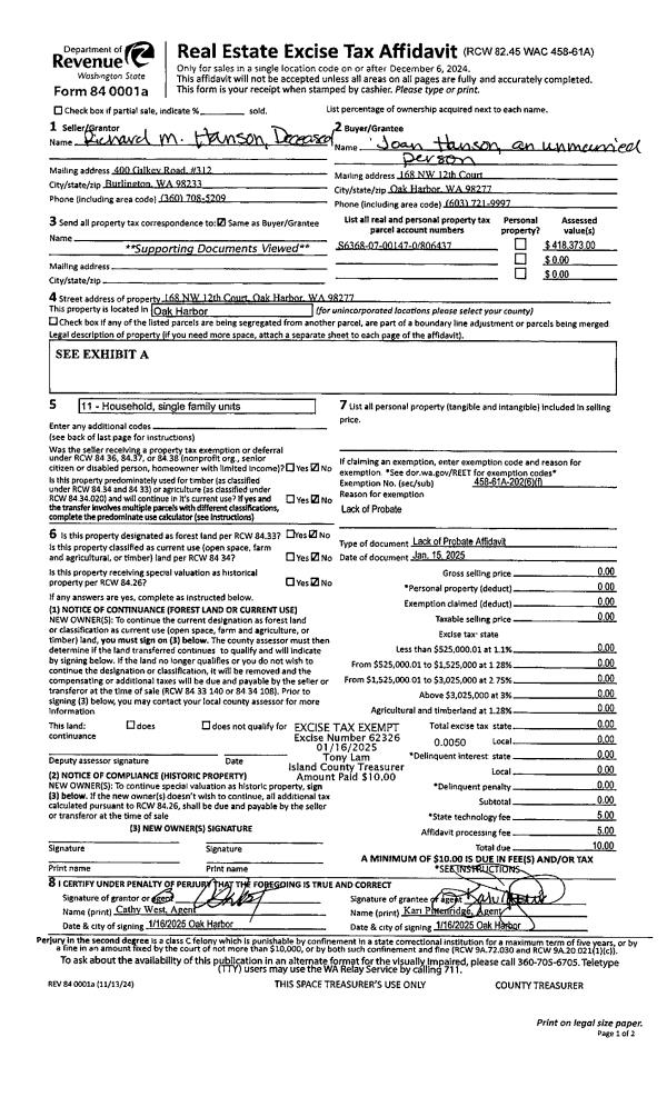 | Mailing Address: | 6523 COLUMBIA BEACH DR CLINTON, WA 98236 | % Ownership: | 100.0000000000% |