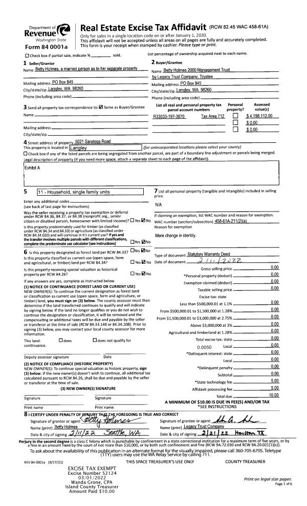 | Mailing Address: | WANDA YOUNG 77 BRADLEY PLACE CAMANO ISLAND, WA 98282 | % Ownership: | 100.0000000000% |