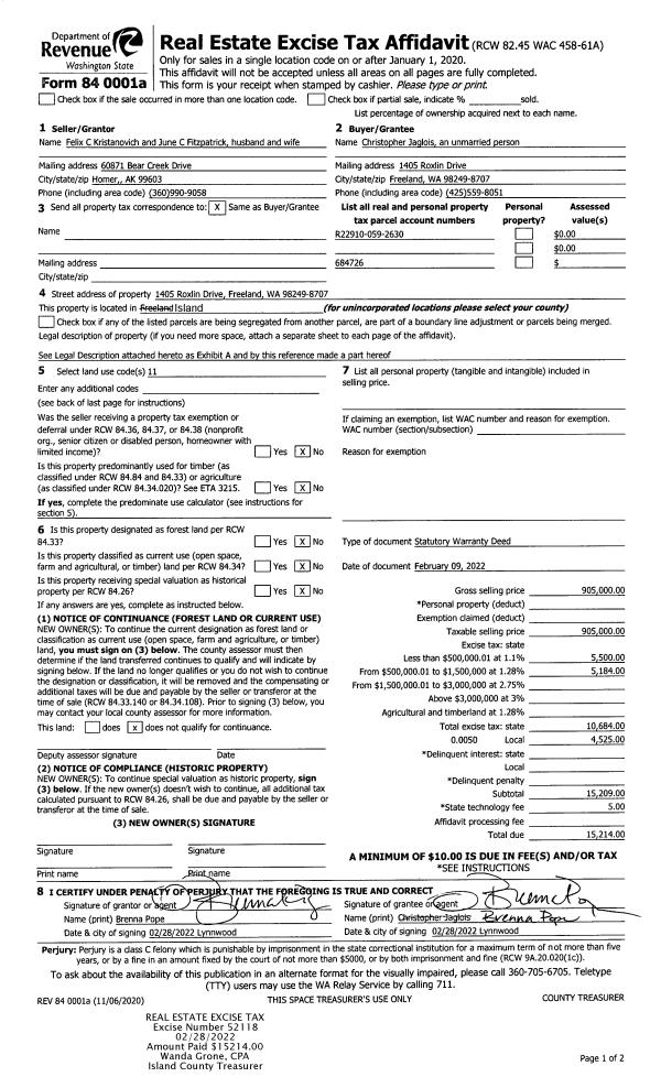 | 1 | 05/03/2024 | EZ | Easement | SUPINISKI, STEPHEN | PUGET SOUND ENERGY | | | $1,135.00 | 60674 | 4574734 |
