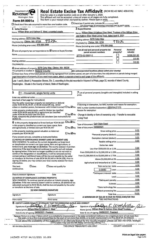 | Mailing Address: | DEBBIE RIDGWAY TRUSTEE 8315 BAYSHORE DR CLINTON, WA 98092 | % Ownership: | 100.0000000000% |