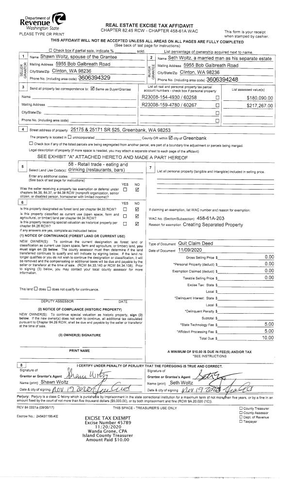 | Mailing Address: | ANNE N JOZALTIS-HOLE 8160 CULTUS BAY RD CLINTON, WA 98236 | % Ownership: | 100.0000000000% |