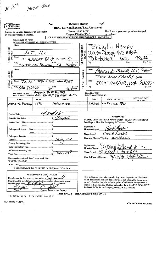 | Mailing Address: | ROCHELLE J JOHANNESSEN 2536 WELLS RD LANGLEY, WA 98260 | % Ownership: | 100.0000000000% |