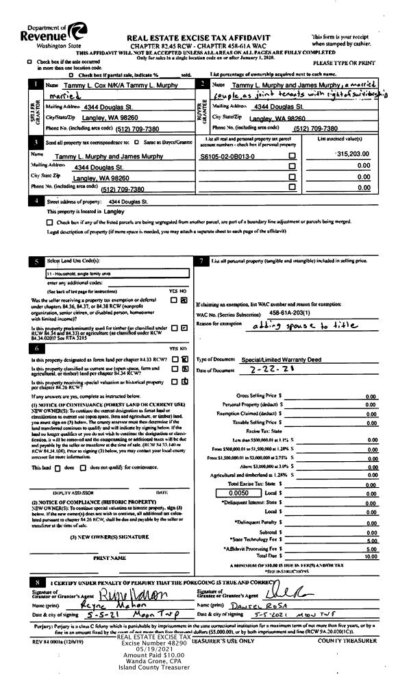 | Mailing Address: | GAYLE LEWELLEN 7876 DECATUR AVE CLINTON, WA 98236 | % Ownership: | 100.0000000000% |