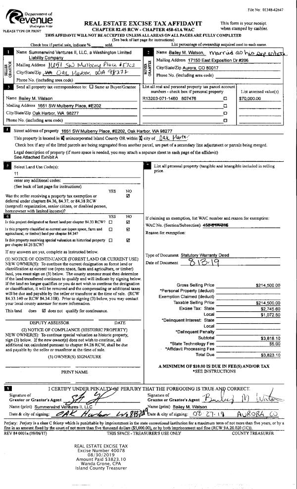 | Mailing Address: | DIANE LARSON 3642 ORCAS DR CLINTON, WA 98236-9213 | % Ownership: | 100.0000000000% |