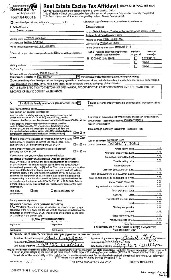 | Mailing Address: | SOUTH LAGOON POINT HOLDINGS LLC (90%) PO BOX 681 COUPEVILLE, WA 98236 | % Ownership: | 100.0000000000% |