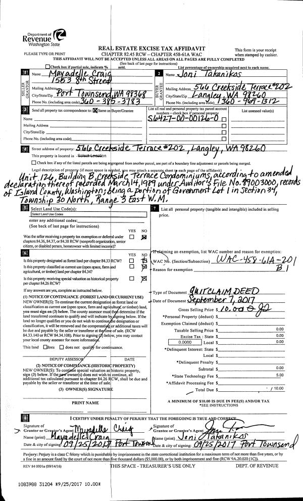 | 2 | 07/31/2017 | QCD | Quit Claim Deed | NURSE, BRUCE L | DUNGENESS CLAW, LLC | | | $0.00 | 30563 | 4427857 |