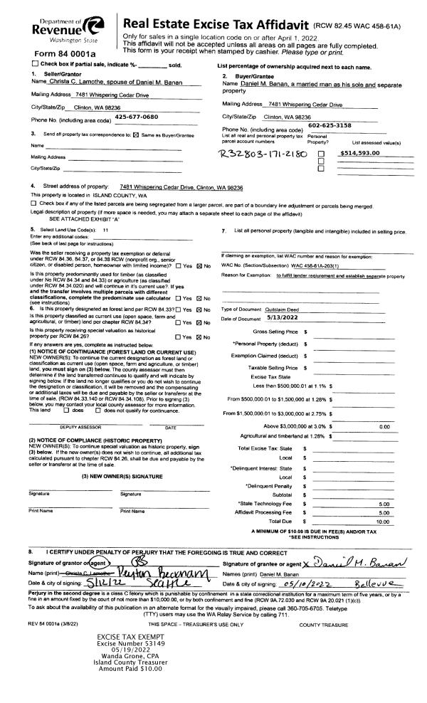 | 8 | 04/24/1998 | ESTSEPPROP | Establish Separate Property | TR CAMANO INC, | TR CAMANO INC, | | | $0.00 | 91397 | 99009254 |