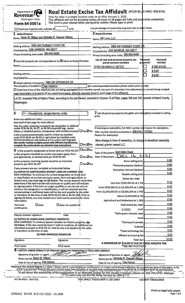 | Mailing Address: | 2995 TILLICUM BEACH DR CAMANO ISLAND, WA 98282 | % Ownership: | 100.0000000000% |