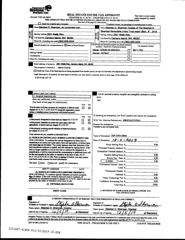 | 2 | 03/22/2018 | TTAXD | Treasurer's Tax Deed | ISLAND COUNTY TAX TITLE | ISLAND COUNTY TAX TITLE | | | $0.00 | 33370 | 4441229 |